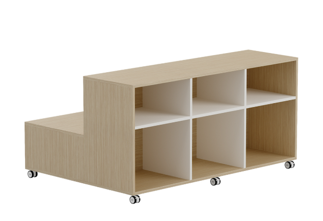 Módulo de mobiliario escolar diseñado para entornos de aprendizaje colaborativo. Se trata de un elemento robusto y minimalista que combina asientos a dos niveles con opciones de almacenamiento funcional.