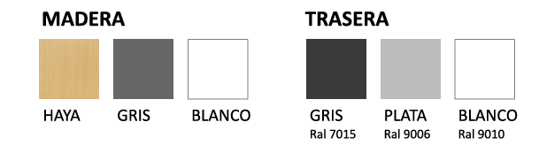 - Fabricado en melamina con acabados que imitan la madera (como haya) y un frontal metálico perforado, en color gris o aluminio.