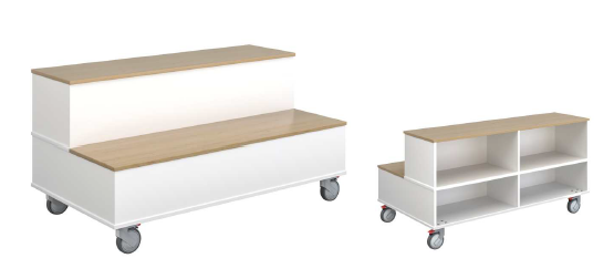 La grada escolar colaborativa está fabricada con paneles de melamina de 19 mm. de color blanco. Equipada con cuatro ruedas con freno. Distribuida en dos alturas, dispone en la zona posterior de dos compartimentos para almacenaje de mochilas, libros, u otros materiales…