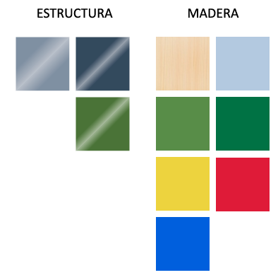 - Estructura: Fabricada en tubo de acero laminado (comúnmente de ø30×1,2 mm) con acabado en pintura epoxy-poliéster en diversos colores como blanco, gris, negro o verde.