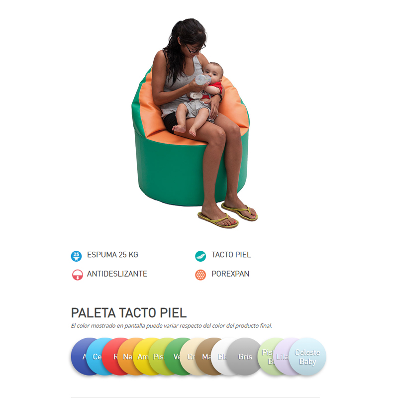 Mobiliario foam (mobiliario relleno de espuma) recubierto de PVC. Los materiales son antialérgicos, antibacterias y fácilmente lavables con agua y jabón; de esta forma nos ajustamos a las necesidades de guarderías, escuelas y centros para que puedan hacer un uso diario del mobiliario de espuma, sin preocuparse del deterioro de la pieza. Fabricado con espuma de poliuretano de 25 Kg, está recubierto de tacto piel o PVC, según demanda. Personalizable, tanto en material como en colores.