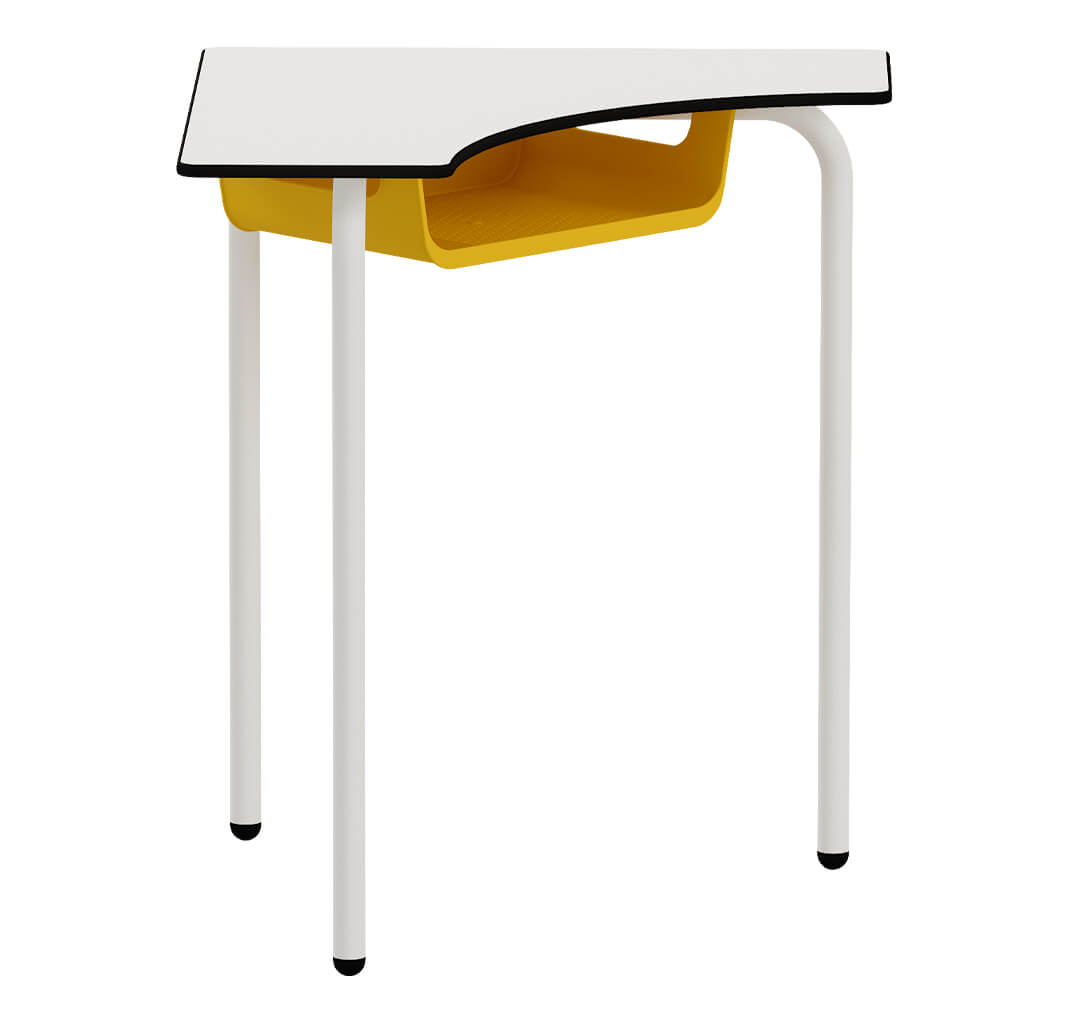 El pupitre Sharp define la dirección. Posición izquierda, derecha o frontal. Minimalista, sin aristas vivas y diseñado para un uso prolongado. Bandeja de polipropileno en varios colores opcional. Acabados CDF y Fenólico en blanco o madera.